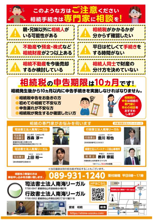 松山で相続や遺言、生前贈与でお悩みをお持ちの方は、この機会にお気軽にお問い合わせください。